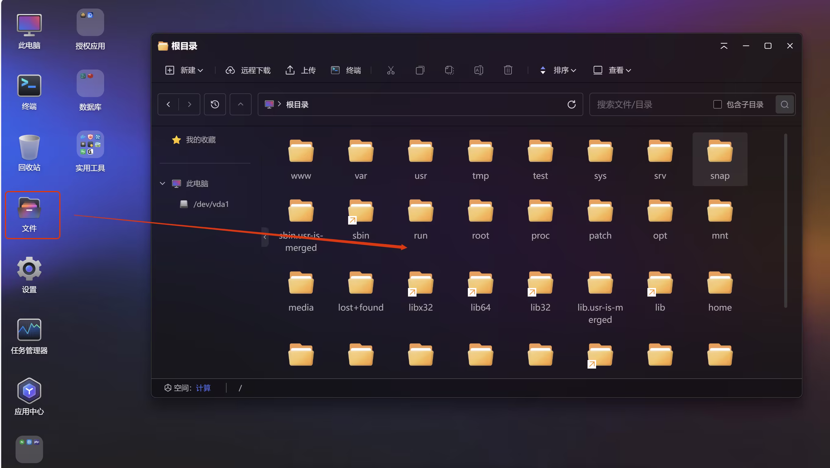 点击文件管理入口,即可直接看到服务器系统内的全量文件与文件夹,以完全图形化的形式呈现,支持文件的新建、删除、复制、粘贴、拖拽上传下载、权限修改等全操作,无需记忆任何 Linux 命令,新手也能轻松管理服务器文件。