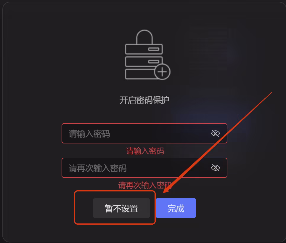 你可根据自身安全需求,选择是否设置密码保护,这里我们以暂不设置为例,完成机器添加。